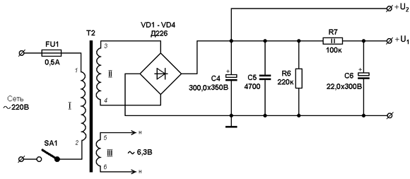 напряжение U1 для анодной цепи триода VL1.1. Величина напряжения U1 должна составлять примерно 200 В.